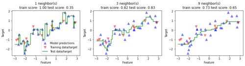 kNN法による回帰 kNNによる回帰を行うときは、KNeighborsRegressorを作成して、fitする。 reg = KNeighborsRegressor(n_neighbors=n_neighbors).fit(X_train, y_train) ソース import matplotlib.pyplot as plt import numpy as np from sklearn.model_selec…